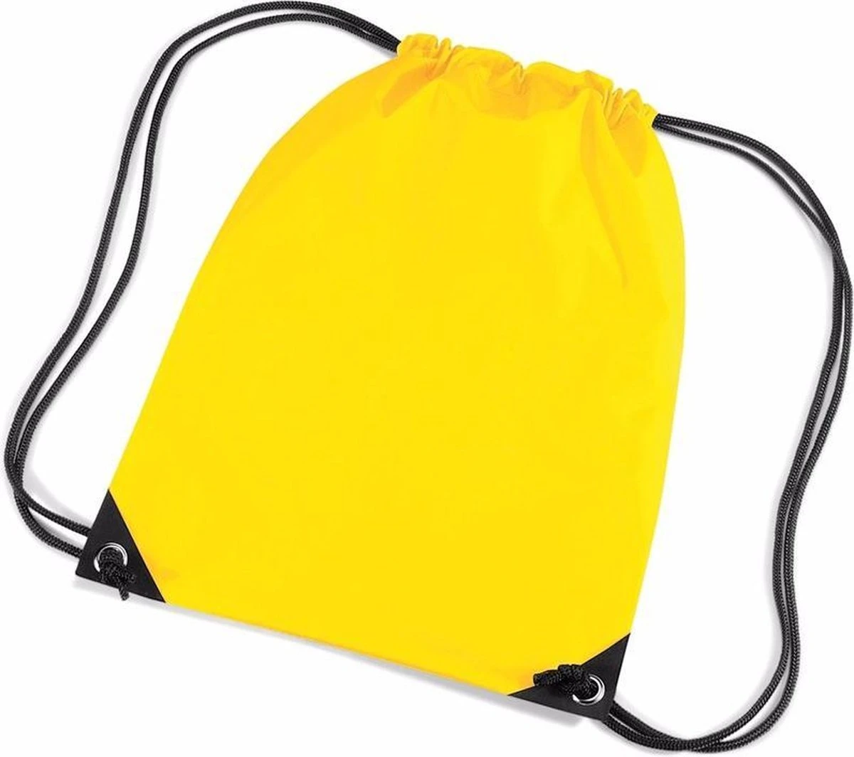 Nylon gymtas in het geel van waterafstotende stof en reigkoord. Inhoud: 12 liter. Afmeting: 45 x 34 cm.
