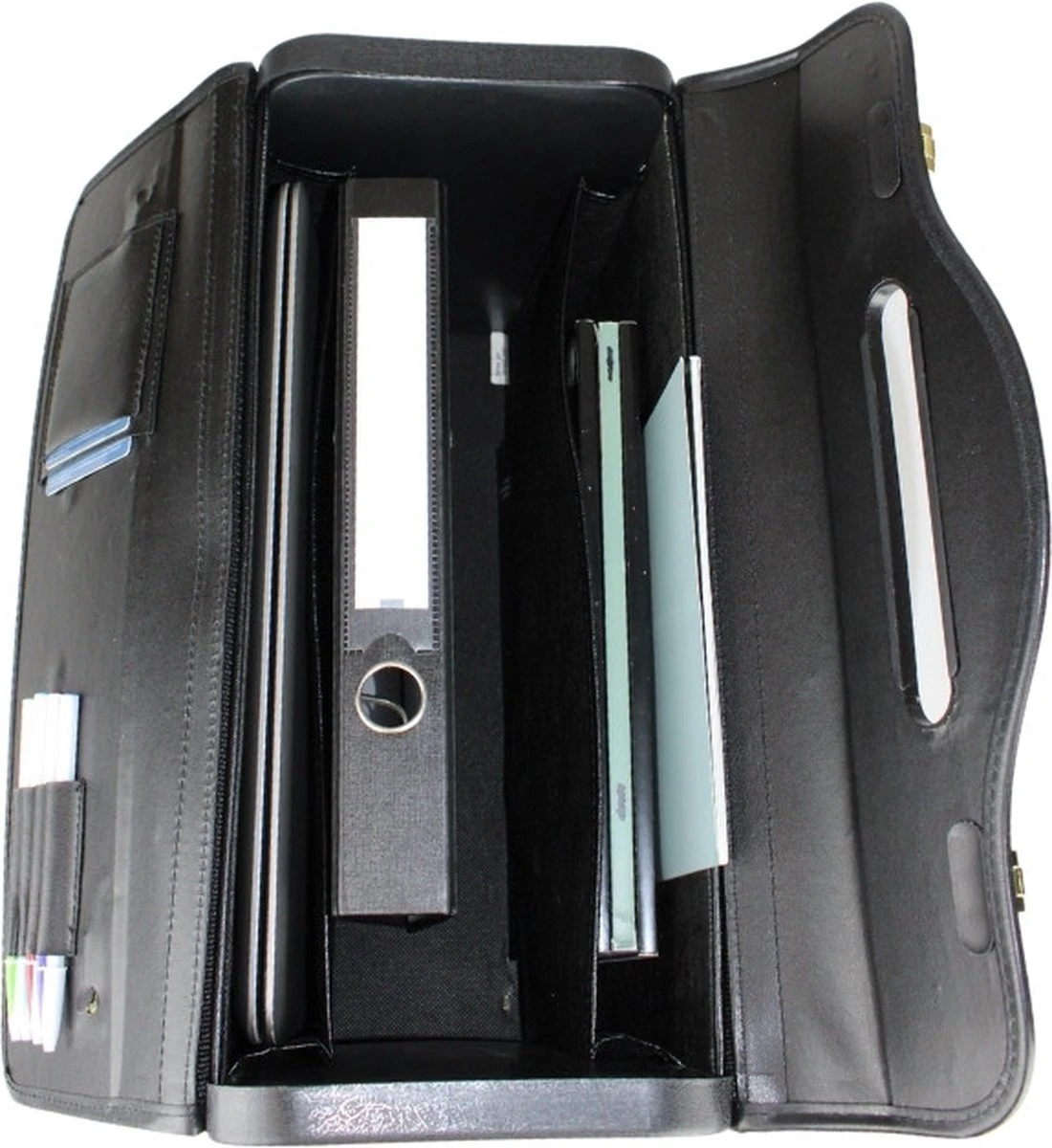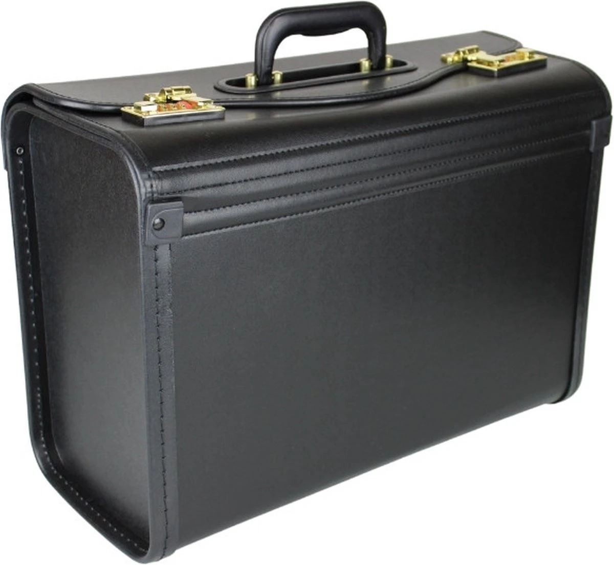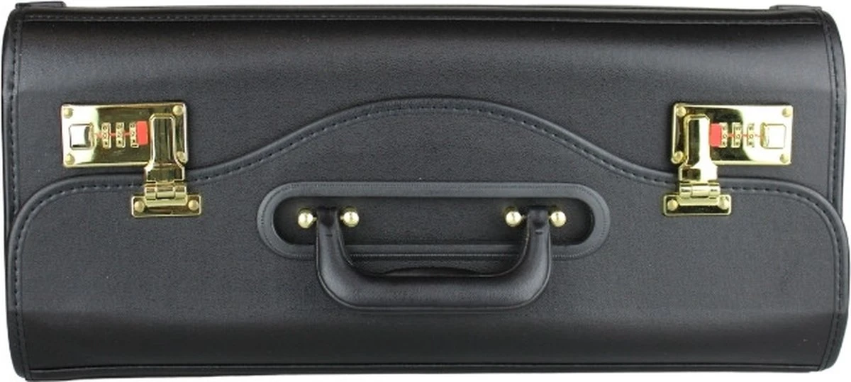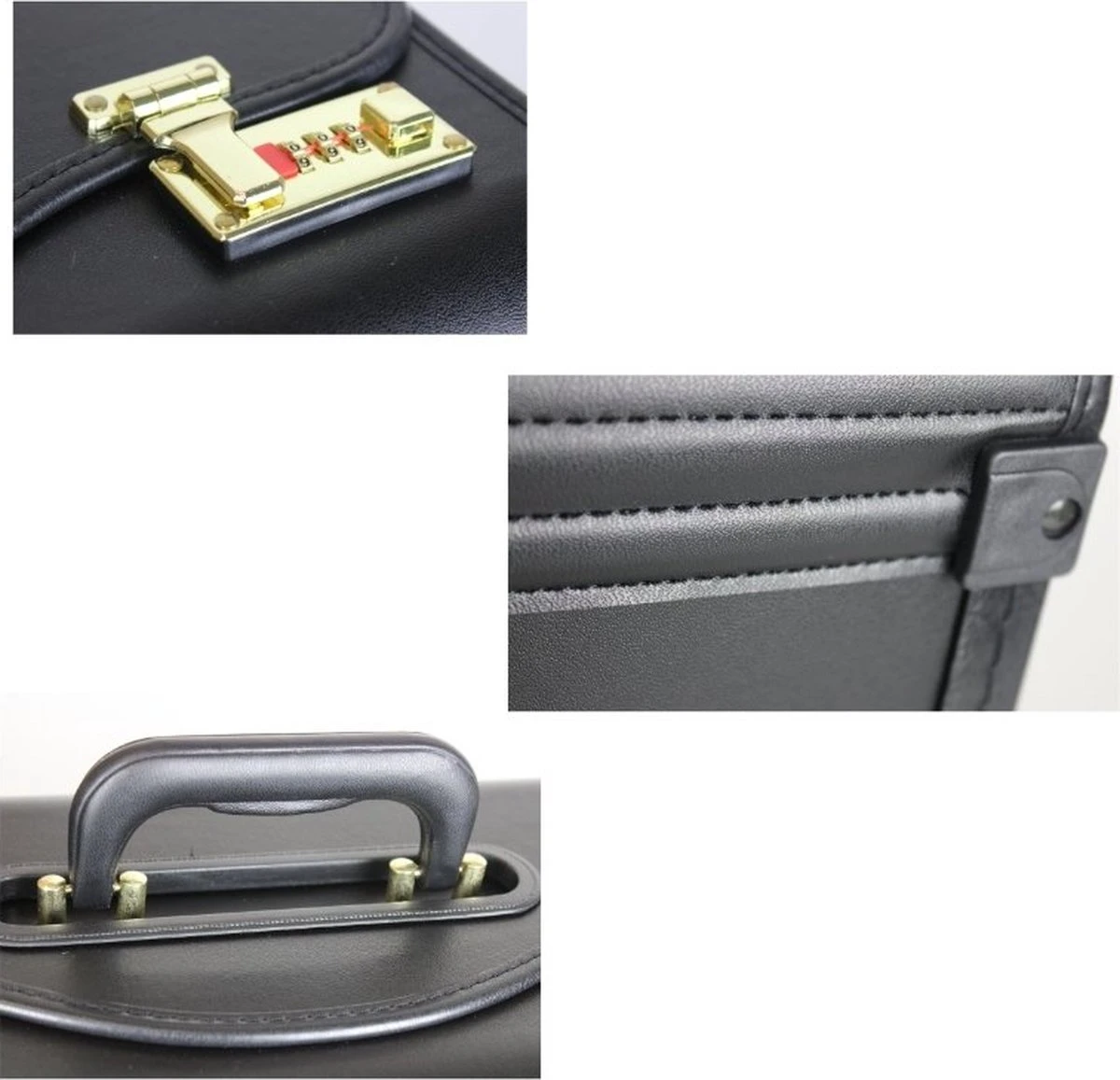 Pilotenkoffer van imitatieleer met ruimte voor een grote map en laptop, stevig handvat en 2 cijfersloten in de kleur goud. Interieur: groot hoofdvak met ruimte voor eventueel 2 laptops, of meerdere mappen, 4 penhouders in het deksel met 2 extra vakken. De pilotenkoffer kan enkel in de hand gedragen worden, dit is een model zonder wielen. Voordeel hiervan is dat de koffer erg lichtgewicht is. Makkelijk te vervoeren in de auto en erg veilig door de dubbele cijferslot. Cijferslot kan eenvoudig gewijzigd worden, hier zit een beschrijving bij toegevoegd.