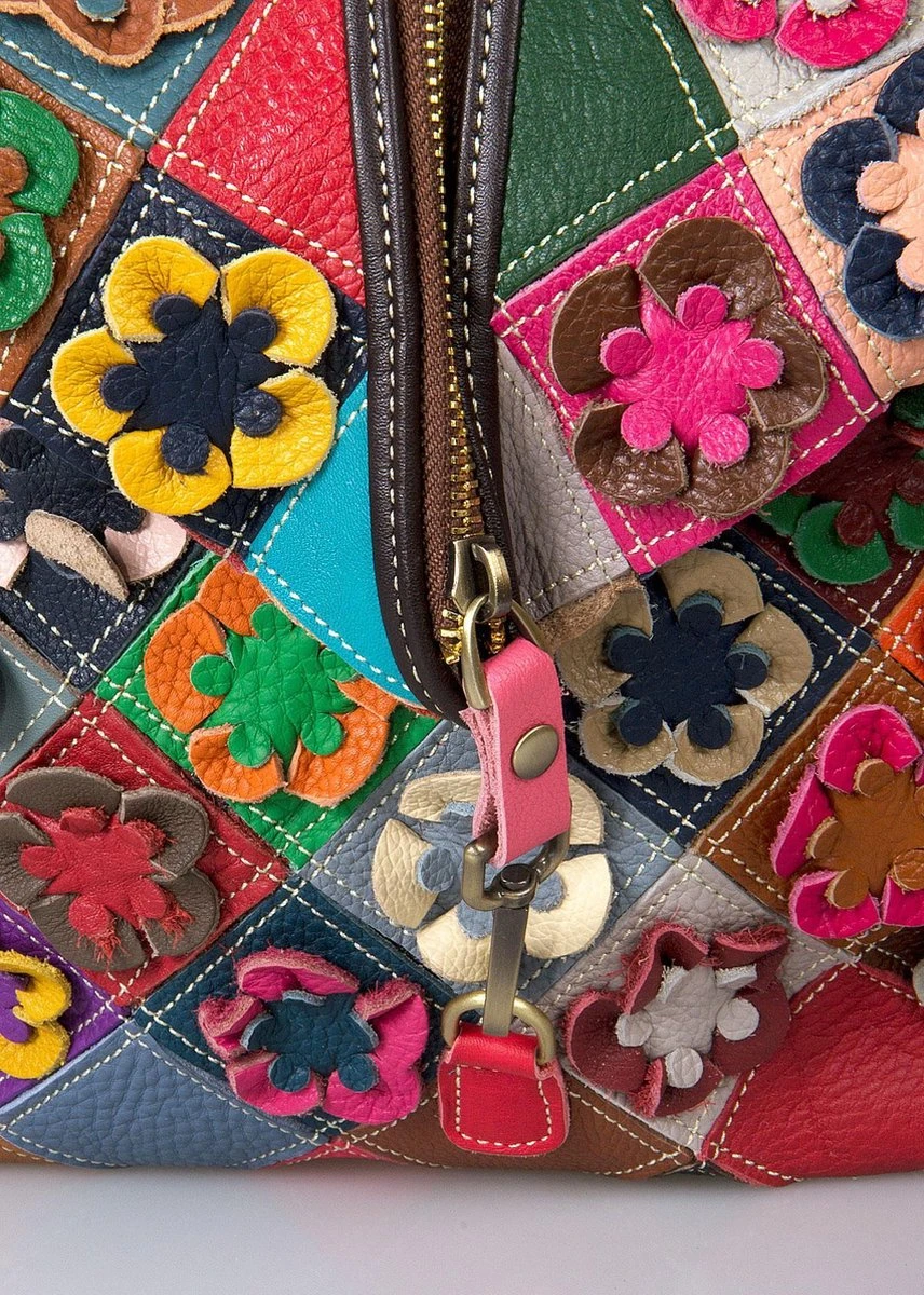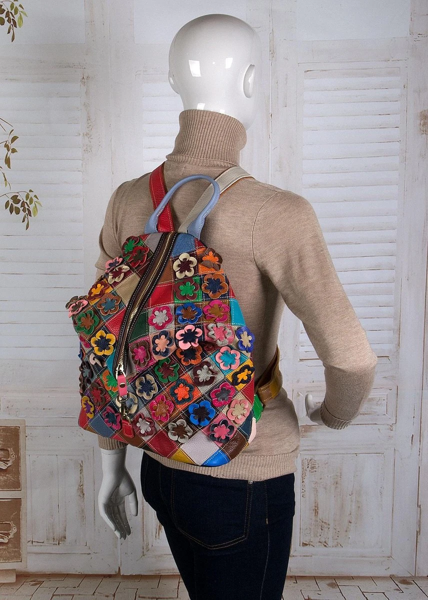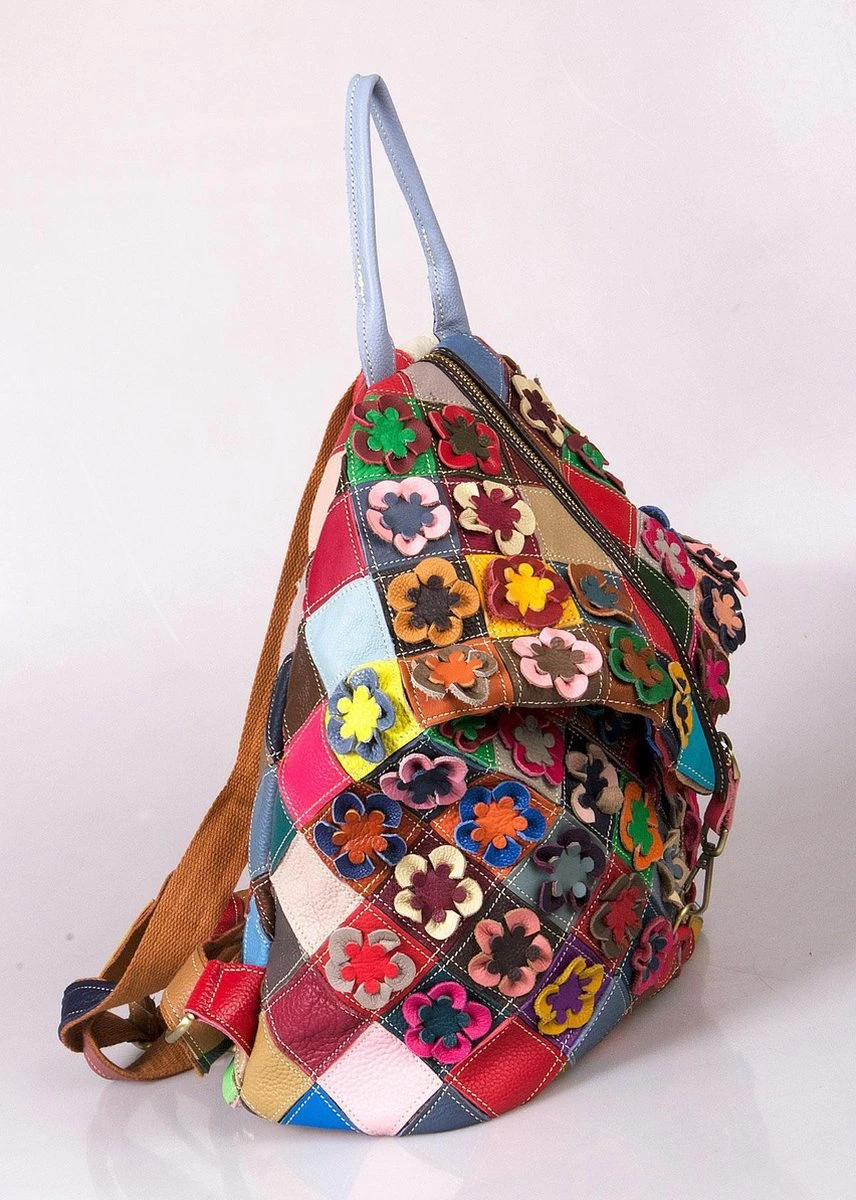 Vrolijke patchwork gevlochten leren rugzak in Ibiza stijl.