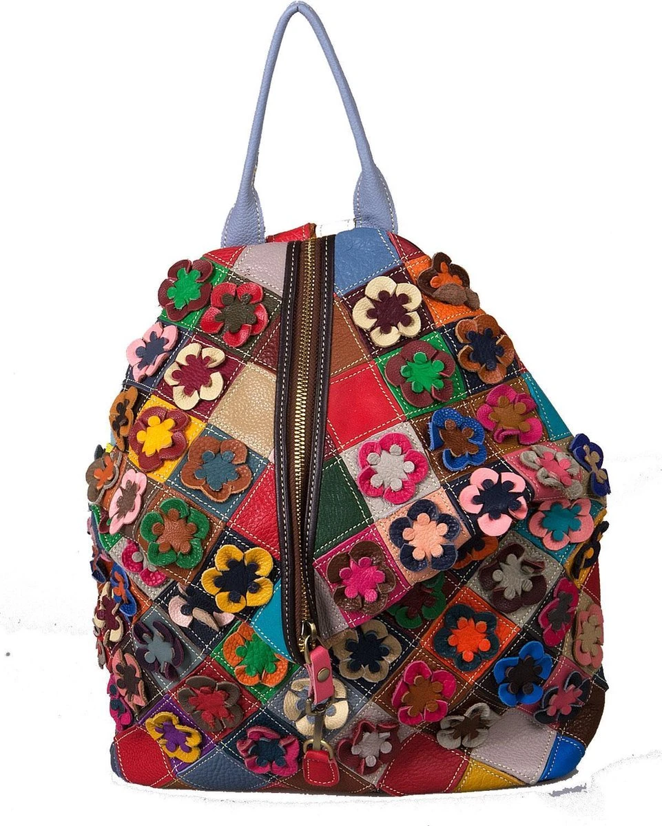 De lederen gekleurde patchwork rugtas is lekker ruim en sluit met een stevige rits en clipsluiting. Aan de binnenkant wat vakjes waaronder een met rits.